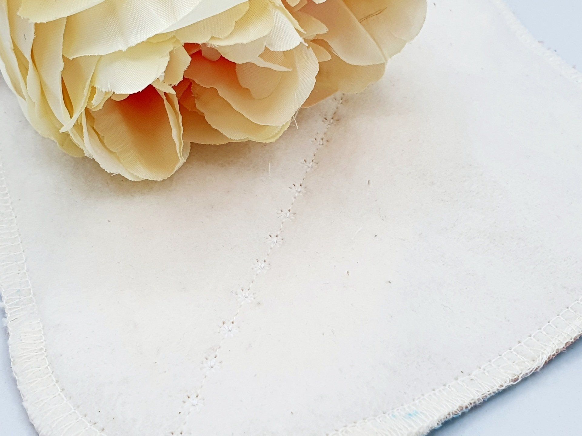 Auf der Hautseite befindet sich immer super weiches Molton in Bioqualität, natürlich ungefärbt.Für die stärkeren Tage kann nach Wunsch in die Einlage ein Kern aus sehr saugfähigem Fleece genäht werden. Dieses hat ebenfalls Bioqualität und ist natürlich ungefärbt.